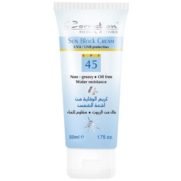 Correction Sun-block cream-Spf45 is a sun protection that does not block skin pores. In fact it contains six Protection factors against UVA/UVB rays ( New Escalol Technology). As well, it has light formula, non-greasy and oil free with a even natural moisturizing factor.