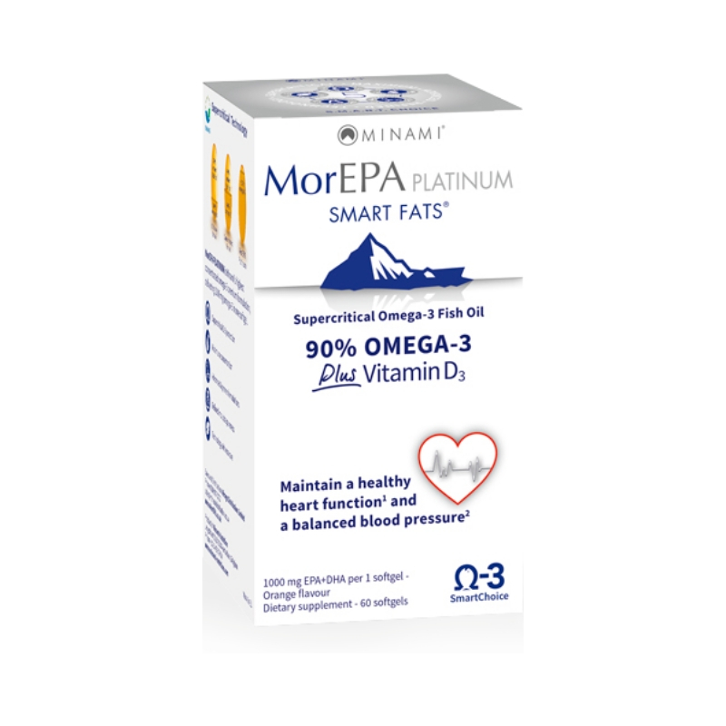 MorEPA Platinum is a highly concentrated (90%) omega-3 food supplement (764 mg EPA + 236 mg DHA + 25 mcg vitamin D3) that contributes rapidly to a balanced omega-3 index.
